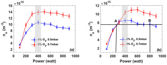 The existence of a plasma density peak may be valuable to obtain the needed densities in the low-temperature plasma because one can save the AC power based on the experimental goals. For example, if one hopes to obtain a plasma density of the Ar-O2 plasma of about , one can set the AC power to about 250 W at the “A” point or about 800 W at the “B” point, as shown in Figure 3b by the black lines. The AC power at “A” point is more economically valuable to obtain the same plasma density. The plasma behavior at about 400 W of AC power is primarily studied because of the density peak.