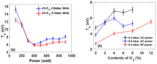 Note: The purpose of the inclusion of two curves for AC power in Figure 5b is to show the effect of AC power for two different pressures as a function of oxygen contents. To compare the behavior of electron temperature with AC power at the same pressure (0.3 mbar), a curve for RF power at 0.3 mbar is also displayed.