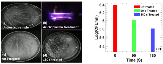 This study aims to evaluate the efficiency of low-frequency AC power supply generated Ar-O2 plasma at low-pressure conditions for sterilizing pathogenic bacteria, a Xanthomonas campestris pv. Vesicatoria (X. c. pv. vesicatoria), which is recognized for causing bacterial spot disease in plants, particularly affecting tomatoes, was treated. A bacterial suspension with a specific concentration of X. c. pv. Vesicatoria, roughly containing 106 CFU/mL, was prepared and spread across the Petri dish. The prepared sample was carefully placed on the lower electrode. Subsequently, Ar-O2 (4% O2) was applied at a frequency of 6 kHz, maintaining a pressure of 0.5 mbar and utilizing 400 W AC power for the plasma treatment process. Photographs of untreated and treated samples of X. c. pv. vesicatoria are shown in Figure 7a–d, respectively. Following the Ar-O2 plasma treatment, the samples were kept in the incubator for 72 h under 28 °C to observe the bacterial growth of untreated and treated samples. Our findings revealed a significant reduction of almost 75% in bacterial growth following plasma treatment for 180 s, as shown in Figure 7e. This promising result underscores the potential application of non-thermal plasma driven by a low-frequency AC power supply at lower pressures as an effective means of controlling and mitigating the impact of plant pathogens, offering a sustainable and environmentally friendly approach to enhance crop health and yield.