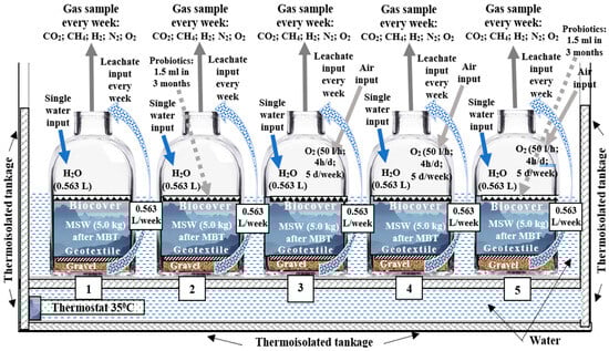 The five different landfill models’ technological inputs and output schemes: 1—the anaerobic landfill; 2—the anaerobic landfill with a dose of probiotics; 3—the aerobic bioreactor landfill; 4—the aerobic–anaerobic landfill; 5—the aerobic–anaerobic landfill with a dose of probiotics.
