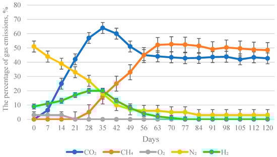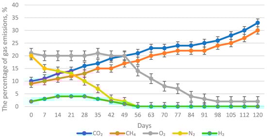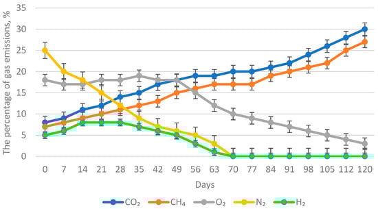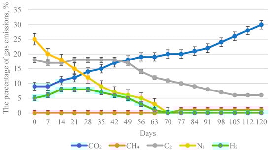The fifth aerobic–anaerobic and flushing bioreactor landfill had parameters different from the fourth. It had low air inflow, single water inflow, leachate recirculation, and a dose of probiotics, creating unique conditions for this landfill model. During the first 56 days of testing, aerobic nitrification–denitrification processes resulted in complete nitrogen removal (from 20% to 0%), and overall waste stabilization improved the biodegradation of the charge (see Figure 6). Biodegradation was enhanced by continuous leachate recirculation. At the same time, a decrease in H2 from 2% to 1% was observed. After that, the activation of anaerobic processes decreased the amount of oxygen (from 14% to 2%) on days 56–120 of this study.