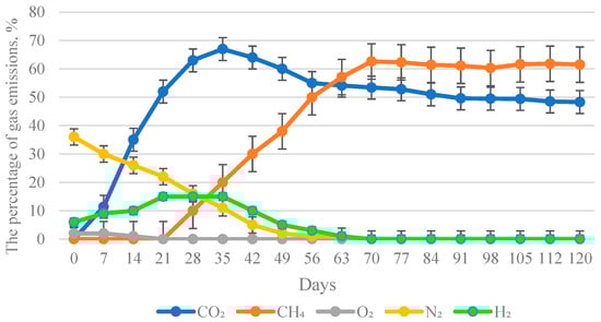 When the MSW was placed in the first landfill model, it began to decompose under anaerobic conditions, resulting in the formation of landfill gas. Like all gasses, these gasses are formed due to physical, chemical, and microbial processes occurring in MSW. It was found that in the acetogenesis phase of landfill gas production, due to the activity of anaerobic bacteria, CO2 (from 25 to 64%) and H2 (from 13 to 20%) increased rapidly on the 14–35th day of the experiment (Figure 2). Meanwhile, O2 (from 3 to 0%) and N2 (from 39 to 18%) decreased significantly, respectively. Later, on days 35–56 of the experiment, the methanogenesis phase began without oxygen in the medium, in which methane-producing methanogenic bacteria started to dominate. In the first landfill model studied, methane emissions increased on day 35 of the experiment. On that basis, at this stage, due to the activity of mesophilic bacteria in the decomposition of MSW, CH4 production increased from 0 to 53%. However, the formation of all other landfill gasses began to decline, respectively, CO2—from 64 to 45%, H2—from 18 to 6%, and N2—from 20 to 4%. This could have been influenced by the microorganisms living here because methanogens are susceptible microorganisms that can consume acetates, hydrogen, and CO2 to produce methane. At the end of the methanogenesis process, on the 56th day of the experiment, equal emissions of greenhouse gasses (CH4 and CO2) were recorded, which were 45%.