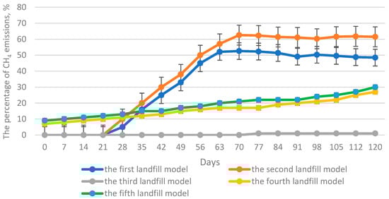 When analyzing the research results obtained from a practical point of view, the most important thing is to pay attention to biogas production in different landfill models. Analyzing all landfill models according to methane emissions, it was found that the most significant amount of this biogas was released in the first and second landfill models (Figure 7). As can be seen, up to days 63–70 of this research, the release of methane continuously increased (up to 60%), and then remained stable. Meanwhile, in the analyzed third, fourth, and fifth models of landfills, methane emissions ranged from 10 to 30%.