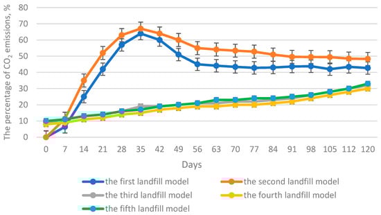 Similar research results were obtained for biogas, such as carbon dioxide, in the first and second landfill models (Figure 8). The highest emission peak of this gas (in the range of 60–70%) was recorded on the 35th day of research. Later, it decreased and fluctuated between 40 and 50%. Meanwhile, in the analyzed third, fourth, and fifth models of landfills, carbon dioxide emissions ranged from 10 to 30%.