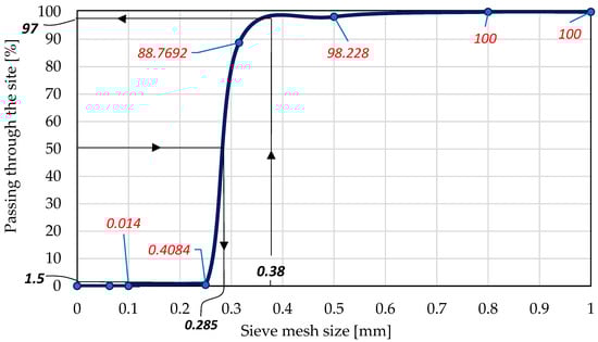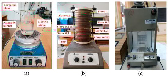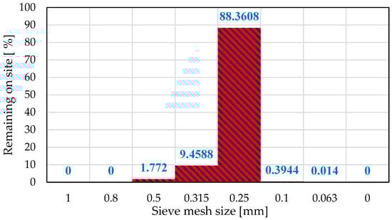 37] with the following mesh side dimensions in mm: 1; 0.8; 0.5; 0.315; 0.25; 0.1; and 0.063. A sample of 50 g of washed and dried sand was used, which was subjected to sieving for about 10 min. The remaining sand on each sieve, including the tray, was weighed using an analytical balance (
