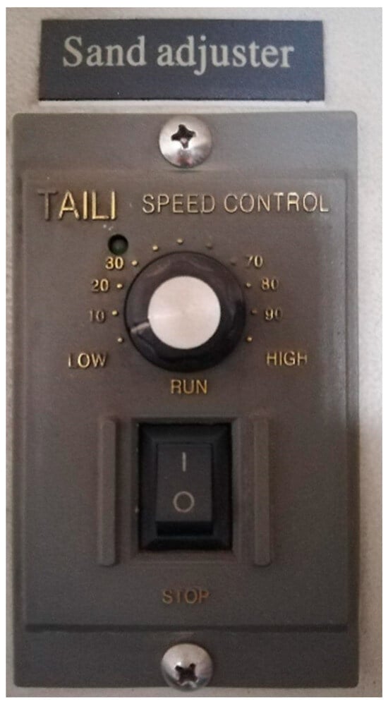 Figure 3. The sand was transported from the abrasive tank and collected in the container (1), from where it flowed by gravity onto the roller (2). This roller was connected to a mechanical transmission system (3), and its speed can be set from the graduated potentiometer present on the machine controller, as shown in