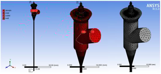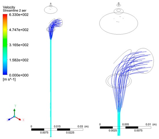 Figure 13. It is observed that the maximum water flow velocity occurs along the ruby orifice and has a value of 633 m/s, decreasing in value as the water jet leaves the ruby nozzle, reaching values below 100 m/s inside the cylindrical steel body of the cutting head. Along the mixing tube, the water jet increases its velocity due to the narrowing of the flow section to around 160 m/s. From samples taken using the CFD-Post program mode along the mixing tube, values of the water jet velocity are obtained in the range from 183 m/s to 210 m/s. Also, in