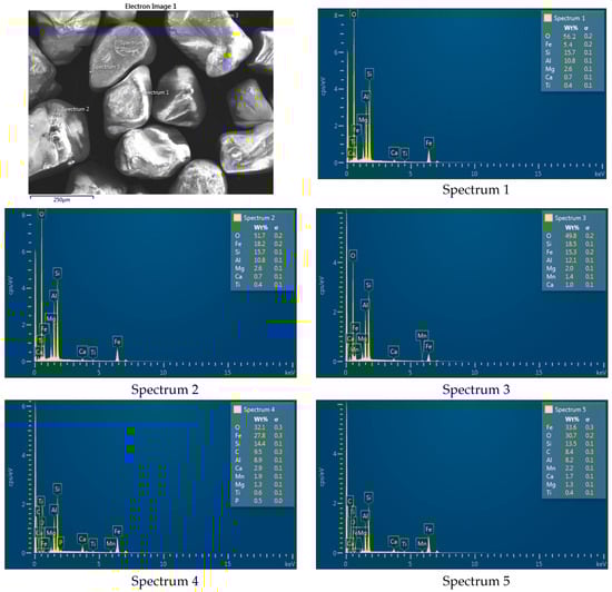 From the chemical analysis conducted with SEM, it can be seen that the main component element is oxygen with a percentage weight between 30.7% (spectrum 5) and 56.2% (spectrum 1), from which we can draw the first conclusion that this sand is mainly made up of oxides. The second component element in the sand structure is Si, with a percentage weight between 13.5% (spectrum 5) and 18.5% (spectrum 3). The third component element is Al, with a percentage weight between 8.2% (spectrum 5) and 12.1% (spectrum 3), followed by Fe between 5.4% (spectrum 1) and 33.6% (spectrum 5). From the analyses carried out on the SEM microscope, it is possible to identify metals such as: Ti, in an amount of approximately 0.4%, Mn (1.4…2.2)%, Ca (0.5…2.9)%, and Mg (1.3…5.3)%, and these metals can, in turn, form different oxides from the composition of sand crystals.