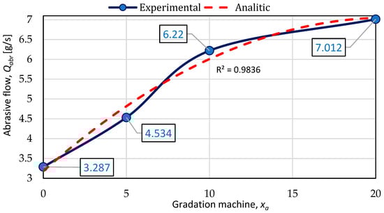 The experimental curve can be approximated, most precisely, with a theoretical curve of order II with the mathematical form given by Relation (12). This parabolic approximation is only valid in the gradation interval 0–20, and in order to establish a distribution law for the abrasive flow over the entire gradation interval of the machine, experimental tests carried out for each division of the machine are necessary.