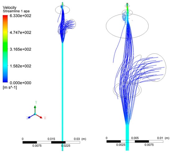 Figure 15 shows the air circuit developed inside the mixing head of the water jet processing machine. It is observed that the air enters the mixing head enclosure at a low speed (below 5 m/s), after which, it is directed by the high-speed water jet through the mixing tube cone and driven to speeds around 160 m/s.