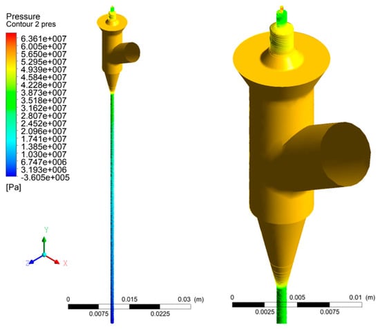 Figure 14. According to this analysis, it is observed that the maximum pressure has a value of 63.61 MPa, decreasing as the water jet leaves the mixing tube. At the exit from the ruby hole, a pressure value of 38.73 MPa is recorded (green area on the pressure map), and the difference between these two values is 24.88 MPa.