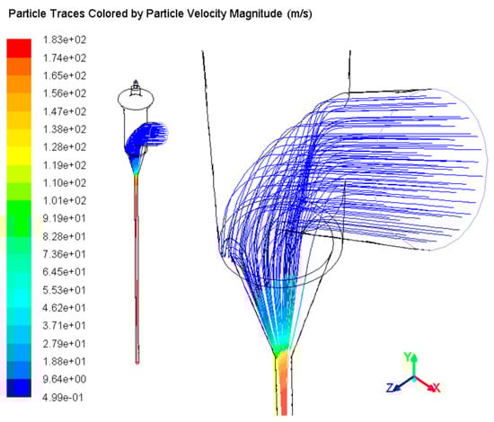 As can be seen, the abrasive particles are carried by the air current to the inside of the mixing head of the machine and driven by the water jet through the mixing tube up to a speed of 183 m/s, meaning that the sand particles are carried by the jet of water as if they are solidly linked to the movement of the liquid. Also in this figure, it can be observed that some particles deviate from their path and hit the annular surface at the base of the mixing cone, leading to the phenomenon of wear due to the erosion of the active elements of the machine.