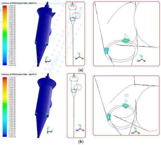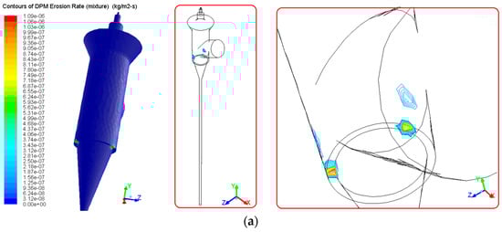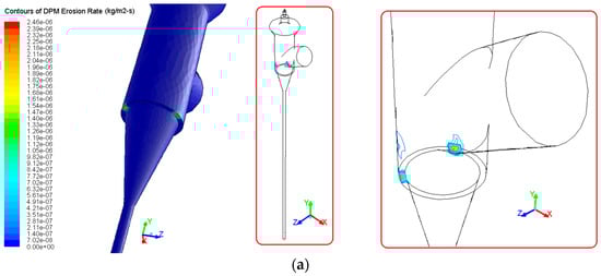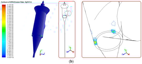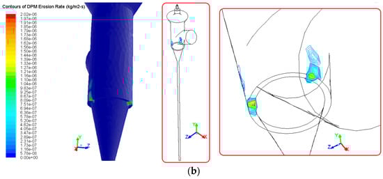 Figure 19b). As in the previous case, the points of maximum erosion occur in two isolated areas from the entrance of the fluid to the conical surface of the mixing tube. It is also observed that some erosion areas located on the inner wall of the steel body of the machine’s cutting head appear near these two points. These secondary erosion zones have maximum values in the range of (1.4…3.5)·10