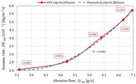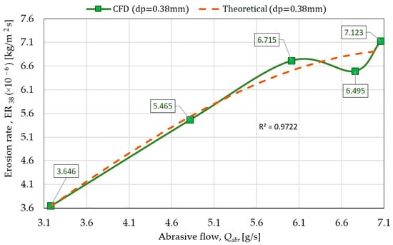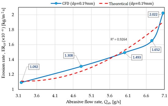 Figure 18 shows the erosion rate as a function of the abrasive flow for the case when abrasive particles have an average diameter of 0.19 mm. On the experimental curve, an almost linear increase in the erosion rate can be observed up to the value of 1.652·10