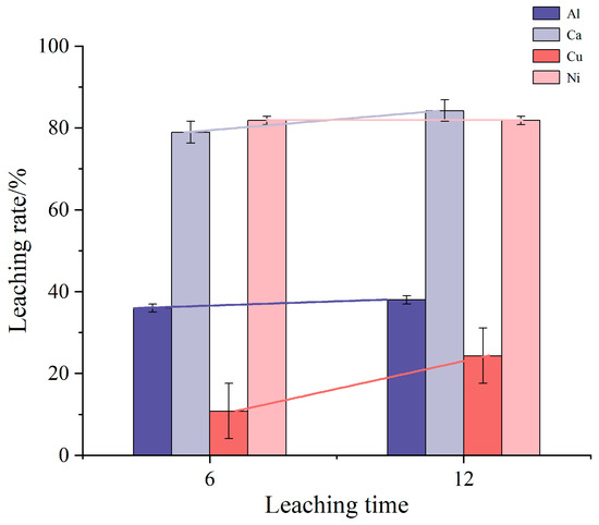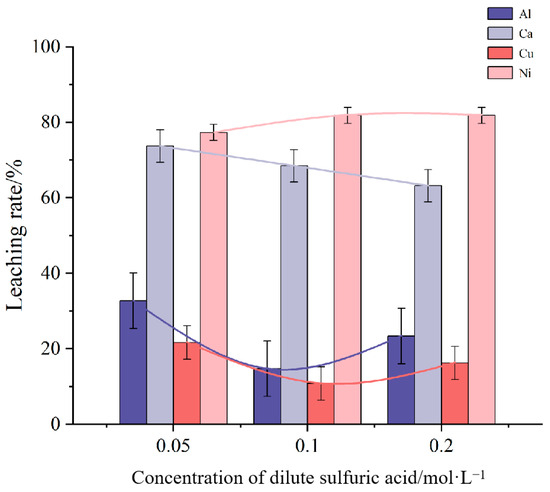 Figure 2 depicts the impact of leaching time on the leaching rates of impurity elements Al, Ca, Cu, and Ni. In this experiment, the concentration of the leaching solution was maintained at 0.2 mol/L, with only the leaching time varying across different groups. The mixture was heated and stirred at room temperature. The results indicate that as the leaching time extends, the leaching rates of Al, Ca, and Cu increase, with Cu showing the most significant increase over prolonged periods, while Al shows a comparatively smaller increase. The limited solubility of Al under these conditions suggests that extending the leaching time does not significantly enhance Al removal. Meanwhile, the Ni content exhibits minimal change with prolonged leaching time, indicating that Ni dissolution has likely reached saturation, and alternative methods are required to further increase its dissolution.