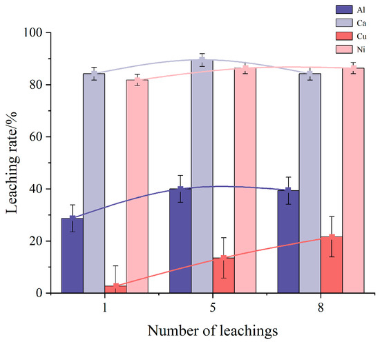 Figure 3 illustrates the effect of the number of leaching rounds on the leaching rates of impurity elements Al, Ca, Cu, and Ni. As the number of leaching rounds increases, the leaching rate of Al initially rises and then falls, reaching a maximum of 40% at five rounds. The leaching rates of Cu and Ni, on the other hand, continue to increase with more leaching rounds, achieving maximum rates of 21.62% and 86.37%, respectively. For the Ca element, the maximum leaching rate of 89.47% is observed at five leaching rounds. The observed trend suggests that the dissolution of other impurity elements may influence the dissolution of Ca, leading to a decrease in its leaching rate as the number of leaching rounds increases. In contrast, the leaching rates of Cu and Ni continue to rise with additional rounds.