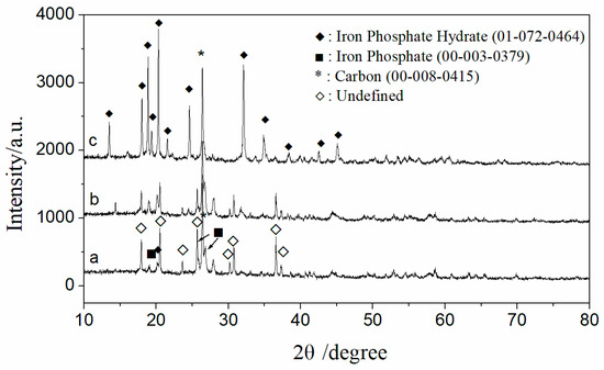 The XRD pattern of the sample purified with sulfuric acid (b) exhibits characteristics that lie between those of the as-received sample (a) and the sample purified with phosphoric acid (c). This indicates that while the dilute sulfuric acid leaching method is effective in removing impurities from iron phosphate recycled from waste LIBs, the dilute phosphoric acid leaching method achieves better purification efficiency. The carbon in the sample was left untreated, as it was suggested by a company representative that the residual carbon may have a beneficial effect on the subsequent synthesis of lithium iron phosphate or could be more easily removed during the synthesis process.