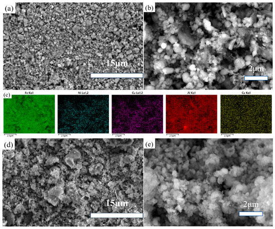 FESEM images of the as-received powders (a–c) and ball-milled samples (d,e).