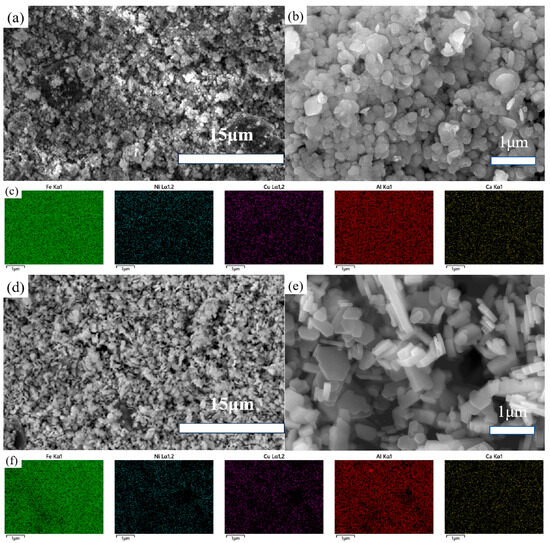 The as-received powders and processed samples were dried for SEM morphological observation. As shown in Figure 5a,b, the as-received powders consist of micro-sized aggregates. Figure 5c presents the colored EDS mapping of the elements examined in this study.