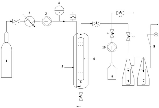 The CO2 high-pressure pump (3) was an SFC-24 high-pressure liquid CO2 pump (Interchim, Montluçon, France). A high-pressure solvent pump (10), GILSON 307 Pump with standard head pump of 5SC type (Gilson International France SAS, Villiers-le-Bel, France), was used to clean the pipes and the micrometric valve (V3) with ethanol at the end of each experiment. The pipes and the micrometric valve were dried with a flow of gaseous CO2 for a few minutes (Valves V2, V3, and V5 open, valve V4 closed). Extraction experiments with pure CO2 were conducted with valves V4 and V5 closed. The CO2 flow and pressure were controlled with micrometric valve (V3). A flowmeter located at the end of the extraction line (8) was used to measure the CO2 flowrate. Regarding the small charges used for SC-CO2 extraction experiments (6.244 g at 350 bar, 45 °C and 6.615 g at 300 bar, 40 °C), the mass of extracted oil was estimated relative to the mass losses of the sample in the extraction autoclave. More information can be found in our previous study [6].