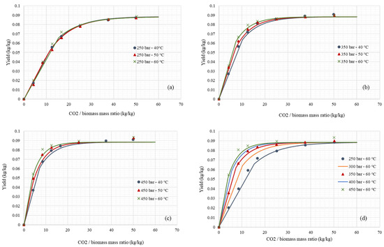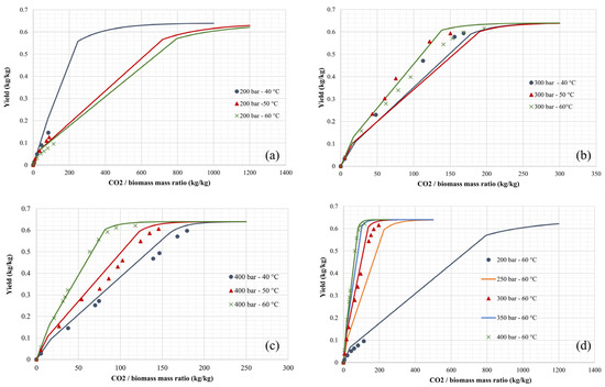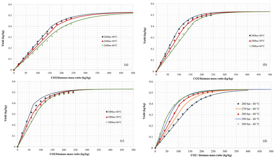The data reported by Natolino et al. [44] show a retrograde solubility behavior up to 300 bar; this behavior was well predicted by the PBICM. In Figure 7d, at 40 °C, it was possible to consistently predict the evolution of the SC-CO2 extraction kinetics from 260 up to 300 bar with a 10 bar step (random conditions).