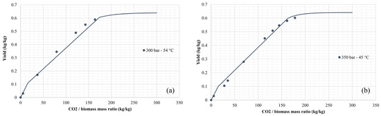The modeling calculations were performed considering the insoluble quantities. However, the extraction kinetics were presented reporting the yield (mass of extracted solute in kg/mass of introduced biomass in kg), given by Equation (15), against the CO2/biomass mass ratio (kg/kg), given by Equation (16), for more convenience.