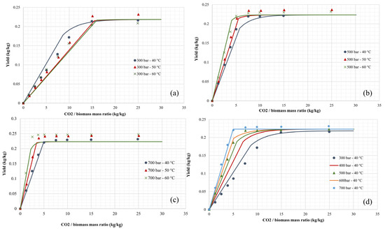At 500 and 700 bar (Figure 5a–c), the evolutions of the extraction kinetics were found to be well predicted (4.47% < AARD < 10.69%). Finally, in Figure 5d, it can be seen that it was possible to consistently predict the SC-CO2 extraction kinetics at intermediate conditions from 300 to 700 bar (with a step of 100 bar) at 40 °C. These conditions were chosen randomly.