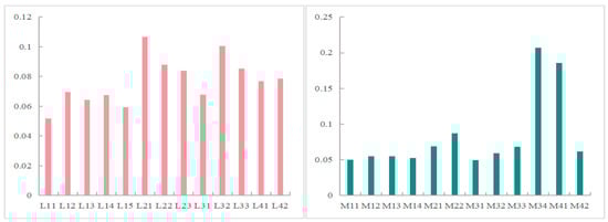 The raw data were standardized using Equations (1) and (2). Then, the CRITIC weighting method was applied to calculate the indicator weights. Figure 3 illustrates the results.
