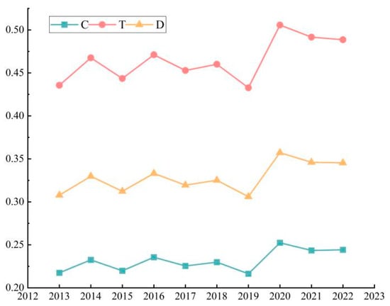 Finally, the coupling coordination degree measures the level of coordinated development between two subsystems. This comprehensive index is used to assess the coupling level of the deep integration and innovative development of the two industries and is denoted by D []. The calculation expression is: