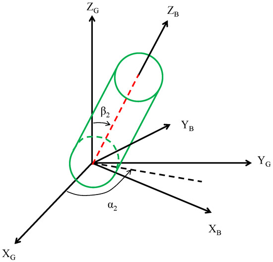 After converting the stress from the Earth coordinate system to the borehole coordinate system, further analysis should be conducted. The transformation relationship between the geodetic coordinate system (GCS) and the borehole coordinate system (BCS) is illustrated in Figure 2, where XB-YB-ZB represents the borehole coordinate system, α2 represents the angle between the borehole trend and the true north direction, commonly referred to as the azimuth angle; β2 represents the angle between the borehole axis and the vertical direction, commonly referred to as the inclination angle. Using σB to represent the stress tensor in the borehole coordinate system, according to the research by Lee et al. [15], the conversion relationship between σB and σG is shown in Equation (3),