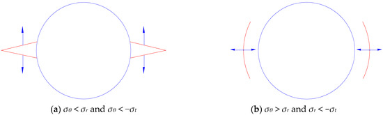 When σr is equal to σ3, and Equation (8) holds true, the wellbore experiences the type of failure depicted in Figure 3b. When σr is not equal to σ3, and Equation (8) holds true, the wellbore experiences the type of failure depicted in Figure 3a. When the type of tensile failure depicted in Figure 3b occurs, no induced fractures are generated around the wellbore and the uniform enlargement of the wellbore diameter along the circumference is caused by the spalling of the surrounding rock. However, when the type of failure depicted in Figure 3a occurs, induced fractures are generated around the wellbore, and when the liquid column pressure is higher than the formation pressure, it may result in drilling fluid loss. The relationship between the angle of the induced fractures and the well axis stress is given by Equation (9).