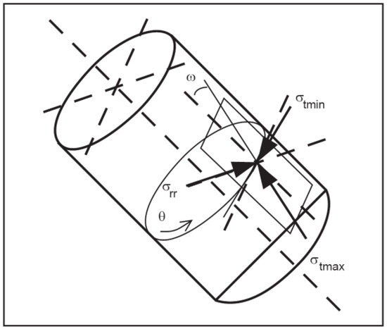 The stress tensor σB, i.e., [σx, σy, σz, τxy, τxz, τyz], represents the stress distribution around a wellbore wall in a borehole rectangular coordinate system, for conveniently, the σB, should be transformed to the polar coordinate system, as shown in Equation (5), which represents the effective stress around any deviated wellbore.