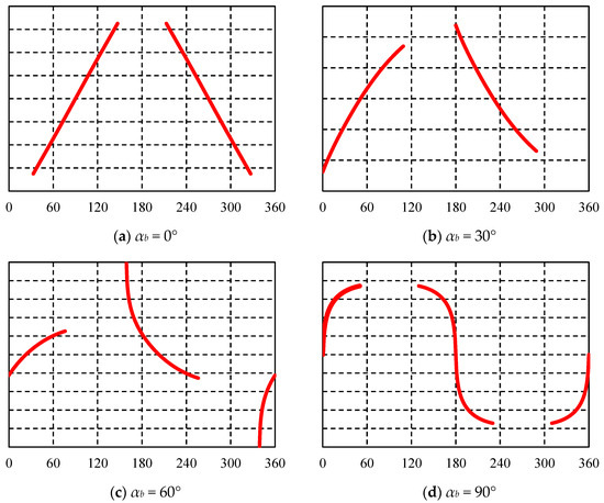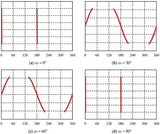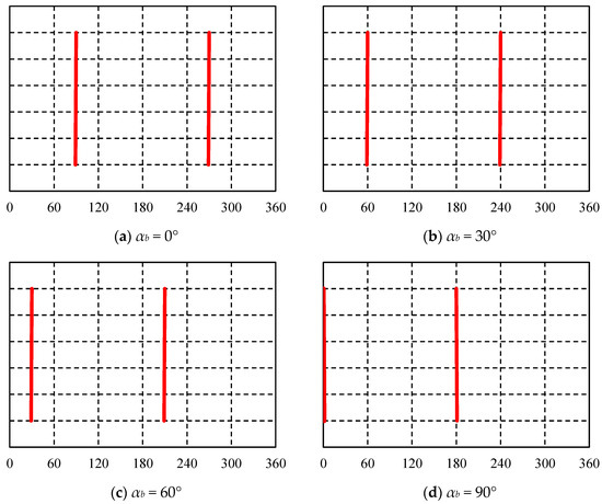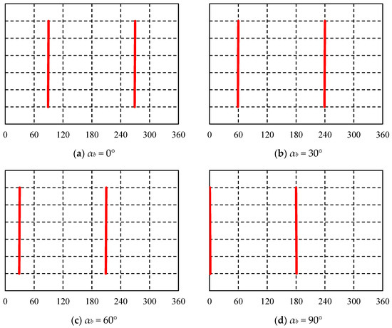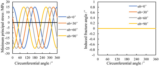 Figure 6 and Figure 7 illustrate the circumferential minimum principal stress and induced fracture characteristics around the vertical wellbore. When the azimuth angle of the wellbore is 0°, the minimum principal stress around the wellbore reaches its minimum value in the direction of the maximum horizontal stress. Additionally, the induced fractures always maintain a 0° angle with respect to the wellbore axis. Therefore, two vertically oriented fractures, spaced 180° apart and symmetrically distributed, are formed around the wellbore in the direction of the maximum horizontal stress. As the azimuth angle of the wellbore increases, the induced fractures around the vertical wellbore always appear in the direction of the maximum horizontal stress. Moreover, since no shear stress is generated in the vertical wellbore, the induced fractures always exhibit a vertical orientation.