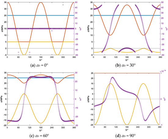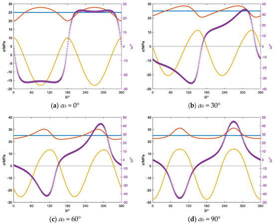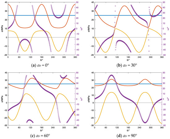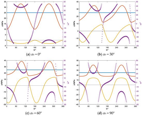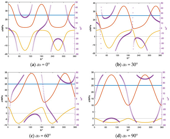 Under the strike-slip fault mechanism, the circumferential principal stress and the induced fracture morphology for wellbores with different trajectories are illustrated in Figure 14, Figure 15, Figure 16, Figure 17, Figure 18, Figure 19, Figure 20 and Figure 21. In Figure 14, the left vertical axis indicates the principal stress, and the purple “+” and right vertical axis indicate the angle between the drilling-induced fracture and the borehole axis, in addition, the orange line represents the minimum principal stress around the wellbore wall, the blue line and red line represent the maximum principal stress intermediate principal stress respectively.