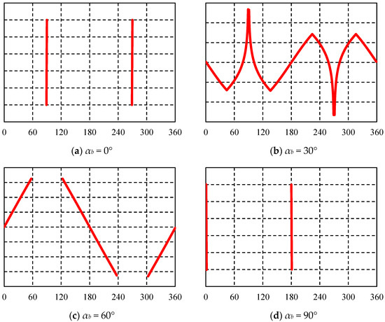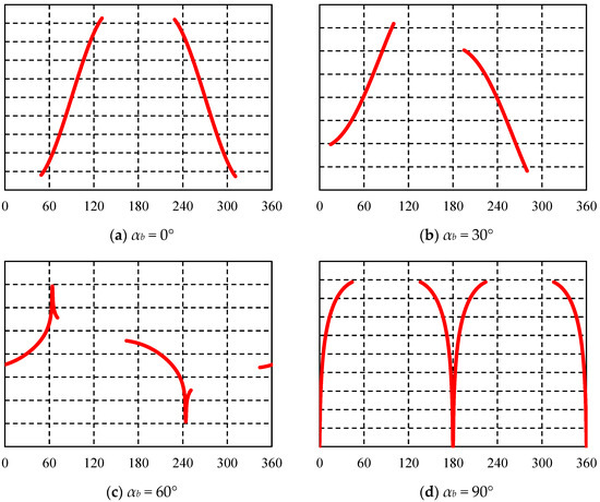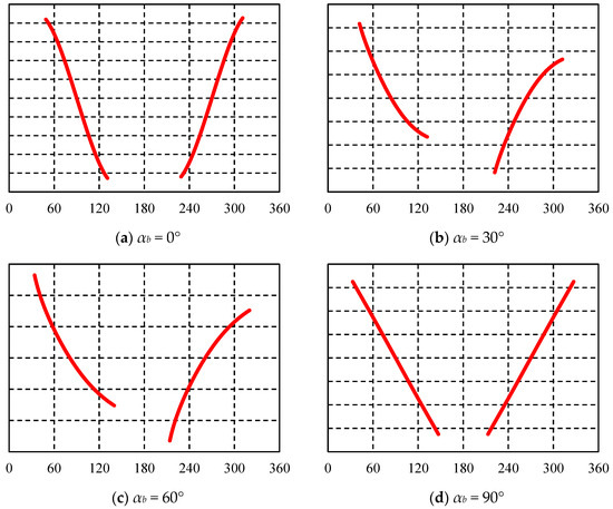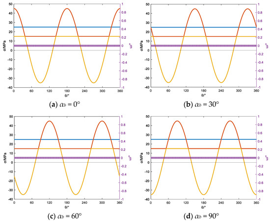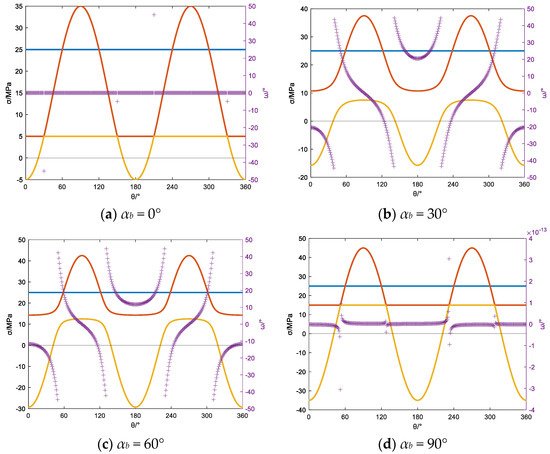 Under normal faulting mechanisms, the wellbore’s circumferential principal stress, induced fracture characteristics, and their angles with respect to the wellbore axis are illustrated in Figure 6, Figure 7, Figure 8, Figure 9, Figure 10, Figure 11, Figure 12 and Figure 13 for different trajectories.