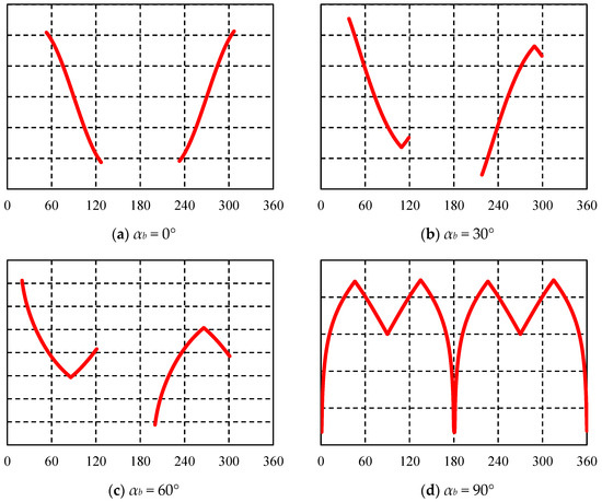 When the wellbore inclination angle is 60°, the circumferential principal stress and the induced fracture morphology for different azimuth angles of the wellbore are shown in Figure 10 and Figure 11. In Figure 10, the left vertical axis indicates the principal stress, and the purple “+” and right vertical axis indicate the angle between the drilling-induced fracture and the borehole axis, in addition, the orange line represents the minimum principal stress around the wellbore wall, the blue line and red line represent the maximum principal stress intermediate principal stress respectively. When the azimuth angle is 0°, the minimum principal stress around the wellbore is tensile stress along the entire circumference of the wellbore, and the angle between the induced fractures and the wellbore axis varies significantly, showing a complex trend. Consequently, the induced fractures exhibit the morphology as shown in Figure 11a. When the azimuth angle is 30° and 60°, the wellbore develops “J”-shaped induced fractures, while at an azimuth angle of 90°, the wellbore exhibits induced fractures with an approximately sinusoidal shape.