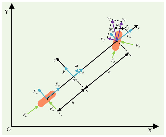 Assuming equal forces act on the two wheels of the front axle of the vehicle, and the forces on the two wheels of the rear axle are also the same. By applying Newton’s Second Law, we can derive the equilibrium equations for the vehicle’s forces in longitudinal, lateral, and yaw degrees of freedom [52], as depicted in Equation (1):