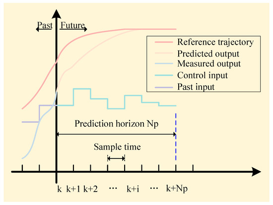 MPC is an advanced algorithm extensively employed in engineering control areas such as autopilot systems, aerospace, and the chemical industry. Through its deep integration with industrial applications, MPC has evolved and become more refined. It employs control strategies such as multi-step prediction, rolling optimization, and feedback correction, providing advantages like effective control, robust performance, reduced reliance on model accuracy, and the ability to handle various constraints in real time [53]. The control principle of MPC is illustrated in Figure 2.
