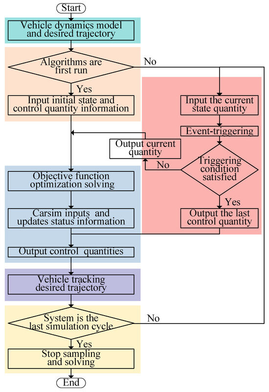 When Equation (27) is satisfied, the event-triggering mechanism acts on the control system, the controller re-optimizes the solution, and the system state is updated as . If the conditions are not met, the system will skip executing a new MPC algorithm at that step and instead use the front wheel steering angle values from the most recent controller output for the vehicle model. In the improved MPC algorithm, the controller performs a calculation and updates the state during the initial sampling moment. Subsequently, at each sampling, if the control system meets the trigger conditions, the MPC controller recalculates and updates the control output. If the conditions are not met, the controller retains and uses the control output from the previous calculation. The flowchart of the event-triggered control algorithm is illustrated in Figure 3.