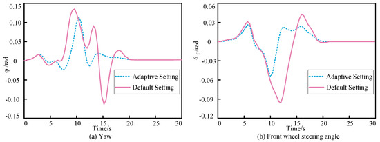 Subfigure (a) shows that the vehicle experiences minor fluctuations within a 5 m longitudinal displacement, and both controllers ultimately achieve tracking of the preset trajectory as the simulation progresses. Subfigure (b) shows that, at 10 s into the simulation, the lateral tracking error for the improved MPC controller is minimized to −0.03 m, while the PHV-MPC controller’s lateral tracking error reaches a maximum of 0.31 m. By 20 s, the lateral tracking error of the improved MPC controller is reduced to 0, whereas the PHV-MPC controller’s error only drops to 0 by 33 s. The steady-state response time of the improved MPC controller is reduced by 39.39% compared to that of the PHV-MPC controller. Overall, Figure 20 indicates that the improved MPC controller not only has a shorter steady-state response time but also achieves a trajectory tracking performance closer to the preset trajectory compared to the PHV-MPC controller. Thus, the improved MPC controller demonstrates superior control effectiveness.