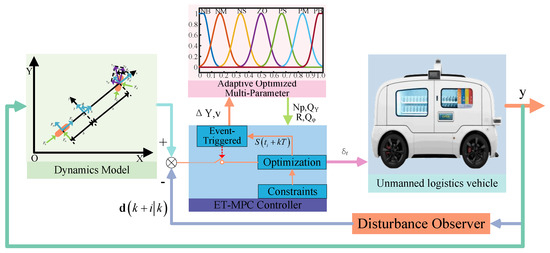 Additionally, key parameters such as the prediction horizon Np, the weight matrices and in the MPC algorithm play crucial roles in determining the controller performance. Xie and fellow scholars introduced an MPC trajectory tracking control method that adjusts the step size of the control horizon using a “dense before and sparse after” chunk matrix. This adjustment is integrated into the quadratic programming solution process [37]. Addressing the challenge of low traction conditions affecting driving stability during trajectory tracking, Wang and other scholars add soft constraints on the side deviation angle to the vehicle dynamics model, and put forward an adaptive MPC based trajectory tracking control algorithm [38]. Wu and collaborators determined the optimal prediction horizon parameters for MPC under various target vehicle speeds using the gray correlation method. They employed Fourier approximation to tailor the prediction horizon parameters and integrate the vehicle dynamics model with the MPC algorithm to establish a semi-empirical model predicting horizon parameters as vehicle speed varies [39]. Zhang and other scholars designed an MPC trajectory tracking controller that adaptively adjusts the predicted horizon according to the different stable states of the vehicle, and also introduced the method of exponential weight reduction the weight coefficients of the objective function are adjusted online [40]. Wang and colleagues introduced a trajectory tracking controller with a variable prediction horizon based on the particle swarm algorithm. This controller adaptively adjusts the prediction horizon by considering comprehensive indicators such as trajectory tracking error, wheel steering frequency, and real-time control algorithm performance [41]. Wang and colleagues introduced an enhanced MPC controller utilizing fuzzy adaptive weight control is proposed to address the path tracking issues encountered by autonomous vehicles [42]. Li and colleagues developed an algorithm that dynamically and adaptively adjusts the weight matrix in the objective function based on the curvature of the reference trajectory. This approach enhances real-time tracking accuracy of the trajectory [43]. Jin and colleagues developed two control strategies: for roads with high adhesion coefficients, they optimized the prediction and control horizons according to different vehicle speeds; for roads with low adhesion coefficients, they activated vehicle stability control and adjusted the weight parameters using an enhanced particle swarm algorithm [44]. A trajectory tracking control strategy utilizing Takagi–Sugeno fuzzy MPC is proposed to enhance the algorithm’s adaptability to varying operating conditions [45]. Qin and colleagues developed a predefined-time trajectory tracking control method based on a fuzzy neural network [46]. ULVs are inevitably influenced by friction and external disturbances during actual goods delivery, so a disturbance observer is incorporated into the controller design. Li and colleagues created a nonlinear disturbance observer that employs an extended Kalman filter to reduce random noise and track both the velocity and non-random disturbances of a mobile robot [47]. Yue and colleagues employed a radial basis function RBF neural networks to create a disturbance observer and an adaptive parameter tuning law for the real-time estimation of combined perturbations in a flexible spacecraft [48]. Sharma and colleagues developed a nonlinear disturbance observer to estimate the external disturbances and parameter uncertainties impacting a quadrotor [49].