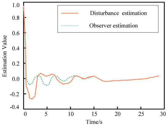where . It can be seen that the disturbance observer converges exponentially, and the convergence accuracy depends on the value of parameter . The larger the value of , the faster the convergence speed and the higher the accuracy.