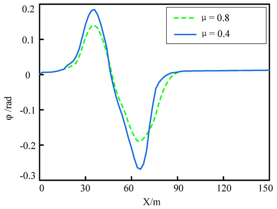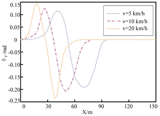 The control algorithm needs to determine different control parameters for different running speeds, and the MPC is robust to changes in running speed. The trajectory tracking effect of the controller is set for vehicle speeds of 5 km/h, 10 km/h, and 20 km/h, respectively, and the result is shown in Figure 19. From the figure, at a vehicle speed of 5 km/h, the maximum front wheel steering angle amplitude is 0.1 rad, and the minimum is −0.18 rad. At a vehicle speed of 10 km/h, the maximum front wheel steering angle amplitude is 0.12 rad, and the minimum is −0.21 rad. At a vehicle speed of 20 km/h, the maximum front wheel steering angle amplitude is 0.15 rad, and the minimum is −0.24 rad. As the vehicle speed increases, the range of front wheel angle amplitude changes also becomes larger. Therefore, in order to ensure good tracking effect, the vehicle speed should be kept within a reasonable range.