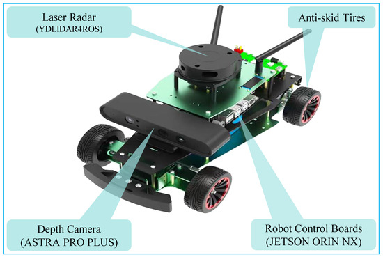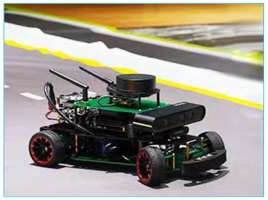 To further validate the effectiveness of the improved MPC trajectory tracking controller introduced in this paper, a ROSMASTER unmanned vehicle experimental platform was built, as shown in Figure 21. The platform is equipped with laser radar (YDLIDAR4ROS), depth camera (ASTRA PRO PLUS), ROS master control (JETSON ORIN NX), CPU (Cortex-A76), 6000 mAh lithium battery pack, 520 encoder motors, anti-skid tires, Ackermann steering structure, and a PC selected Lenovo Thinkpad. The experiment vehicle can realize robot motion control, trajectory tracking, following obstacle avoidance, automatic driving and other functions.
