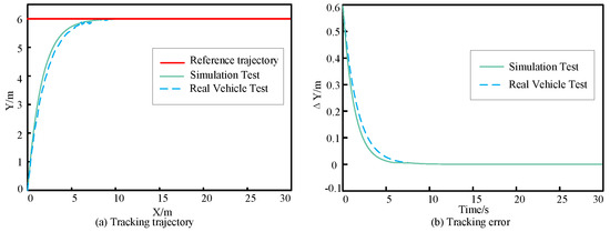 Due to the objective conditions, the experimental program itself has certain uncertainties, the experiment can only be carried out in a limited experimental environment, the tracking trajectory conditions are restricted to a large extent, and it is not possible to verify all the simulation conditions proposed in this paper. So only through the construction of ROSMASTER experimental platform on the straight line trajectory conditions in the experimental conditions allowed to carry out a low speed driving verification. The trajectory tracking experimental setup for the ULV is depicted in Figure 23. The effectiveness of the trajectory tracking controller is assessed by examining the lateral displacement and lateral error during the vehicle’s tracking of a straight-line trajectory. The results of the experimental vehicle tests are presented in Figure 24. Subfigure (a) compares the lateral displacement effects of trajectory tracking between simulation tests and experimental vehicle tests. It shows that the experimental vehicle can track the straight-line trajectory quite effectively, with results closely matching the simulation, although some oscillation is observed during the initial tracking phase. Subfigure (b) compares the lateral error results between simulation and experimental vehicle tests, indicating that during straight-line tracking, the lateral displacement error in the experimental vehicle with a maximum distance error of 0.55 m, thus achieving trajectory tracking within the acceptable range of steady-state error.