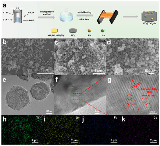 (a) Preparation process of FC@TiO2-JH; SEM images of (b) NH2-MIL-125(Ti), and (c,d) FC@TiO2-JH at different magnifications; (e,f) TEM images of FC@TiO2-JH at different magnifications; (g) HRTEM image of FC@TiO2-JH; and EDS mapping of (h) Ti (green), (i) O (yellow), (j) Fe (blue), and (k) Co (purple).