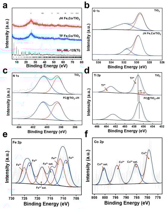 (a) XRD of prepared samples; TiO2-JH and FC@TiO2-JH of (b) O 1s and (c) N 1s; FC@TiO2-JH of (d) Ti 2p, (e) Fe 2p, and (f) Co 2p.