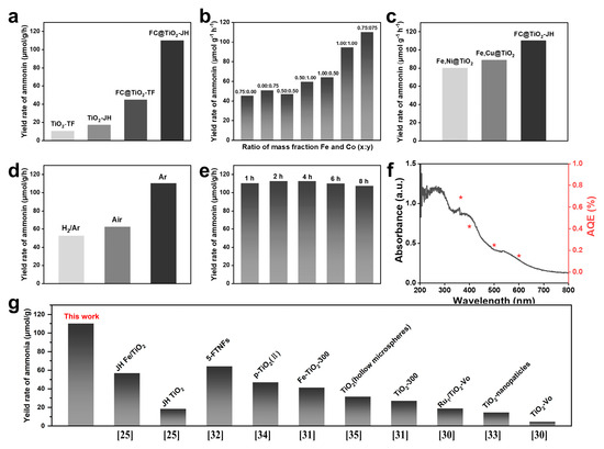 Photocatalytic N2 fixation activity of (a) TiO2 and FC@TiO2 obtained from different calcination methods, (b) different ratios of Fe: Co, (c) Fe, M@TiO2-JH with the different metals (M = Cu, Ni, Co), (d) FC@TiO2-JH in different atmospheres, (e) FC@TiO2-JH cycle tests; (f) AQE (red asterisks) and the light absorption spectrum of FC@TiO2-JH; (g) comparison of photocatalytic nitrogen fixation performance levels with different catalysts.