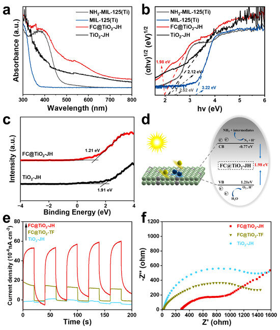 The optical properties of different catalysts were evaluated by UV–Vis DRS. As presented in Figure 4a, MIL-125(Ti) had an optical response in the UV region only from 200 nm to 380 nm. NH2-MIL-125(Ti) could enhance the optical response from 200 nm to 500 nm, indicating that -NH2 effectively increased light absorption. Moreover, TiO2-JH and FC@TiO2-JH had a wide range of response in the full spectrum from 200 to 800 nm. Furthermore, the light absorption intensity was enhanced, which might have been due to the doping of Fe, Co, and the creation of defects by the FJH method. As depicted in Figure 4b, the Eg values of MIL-125(Ti), NH2-MIL-125(Ti), TiO2-JH, and FC@TiO2-JH were about 3.22, 2.52, 2.12, and 1.98 eV, respectively. Fe, Co doping and generation of defects have been demonstrated to narrow the bandgap. Furthermore, the XPS valence band (VB) spectrum showed that the VB of TiO2-JH and FC@TiO2-JH were 1.91 and 1.21 eV, respectively (Figure 4c). Based on the equation Eg = EVB − ECB, the conduction band (CB) of FC@TiO2-JH was calculated as −0.77 eV (Figure 4d). The CB potential became more negative after Fe, Co doping and played a role in the photoreduction thermodynamically. Therefore, FC@TiO2-JH showed the best NH3 yield rate.