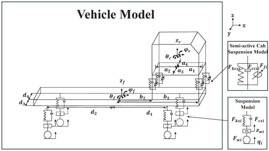 where is the distance from the suspension to the vehicle’s center of mass, is the distance from the lower support point of the cab suspension to the vehicle’s center of mass, representing geometric parameters, and is the distance from the upper support point of the cab suspension to the center of mass of the cab. The variable q denotes the road excitation, is the vertical displacement of the suspension spring, is the vertical displacement of the frame, and is the vertical displacement of the cab. The relative displacements and velocities are provided in Appendix A.